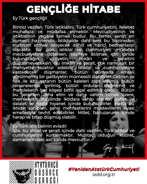 Ey Türk istikbalinin evladı! İşte, bu ahval ve şerait içinde dahi vazifen, Türk istiklal ve cumhuriyetini kurtarmaktır. Muhtaç olduğun kudret, damarlarındaki asil kanda mevcuttur.
